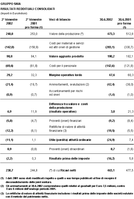 Milano, 31 luglio 2002 - Il Consiglio di Amministrazione della Snia, riunitosi oggi a Milano sotto la presidenza di Umberto Rosa, ha esaminato i risultati del Gruppo nel secondo trimestre 2002. Nel periodo, i ricavi sono stati pari a 238,7 milioni di Euro, in crescita del 6,4 % rispetto al primo trimestre 2002.