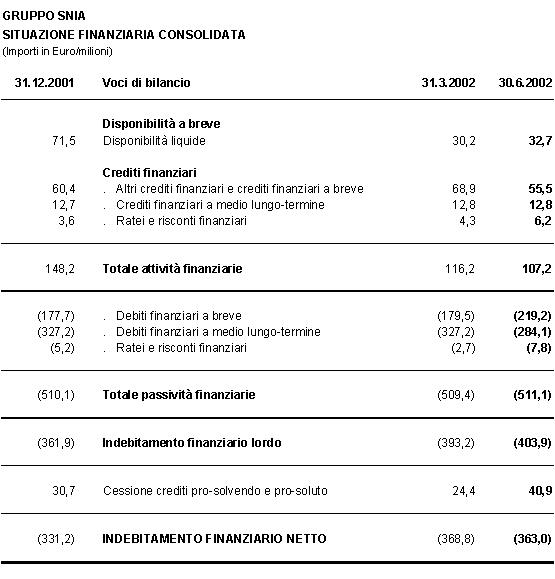 Il risultato ante imposte del precedente trimestre era stato negativo per 14 milioni di Euro. L’indebitamente finanziario netto del Gruppo Snia al 30 giugno 2002 e’ pari a 363 milioni di Euro, contro 368,8 milioni di Euro al 31 marzo 2002.