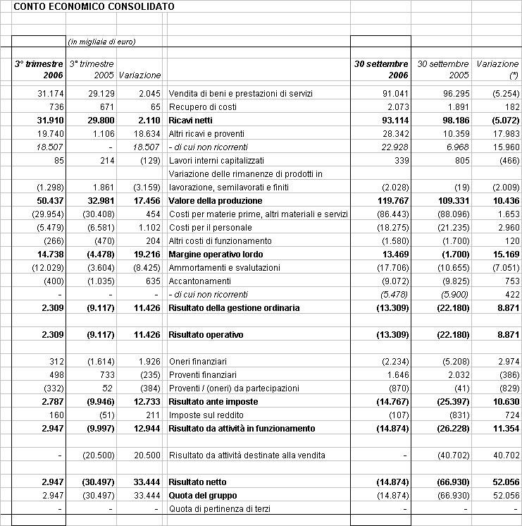 'Al netto delle componenti straordinarie il MOL registra un miglioramento pari a 0,7 milioni di euro' ha dichiarato l’ Amministratore Delegato Andrea Mattiussi, 'anche per effetto degli interventi previsti dal Piano Industriale 2006-2010'.